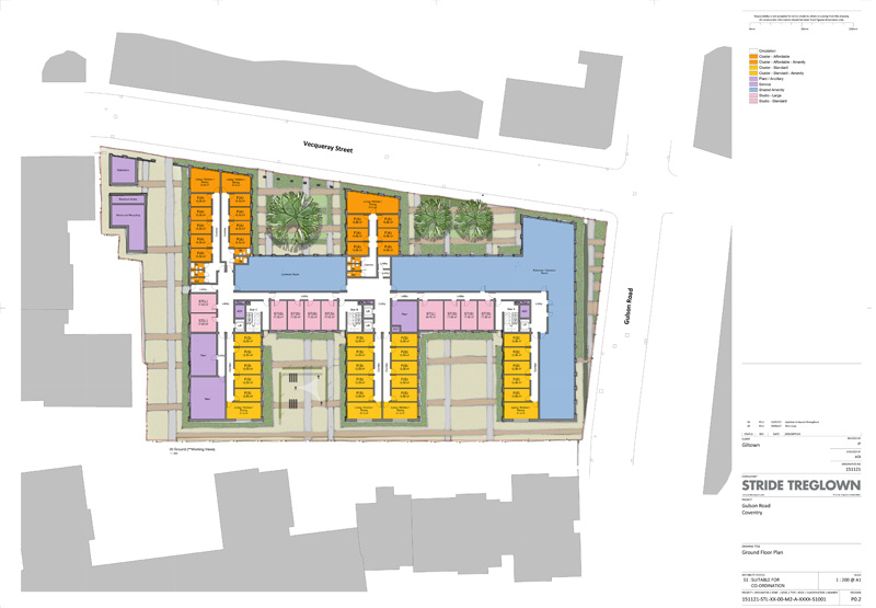 The proposed scheme provides accommodation for 464 students across the site in a single building, equivalent to freeing up around 93 shared houses across the city. The building is planned as 3 storeys tall along Vecqueray Street, so that it better reflects the height of the terrace opposite. Further into the site, away from the existing houses, the building steps up to 8 storeys in height, around the same height as the top of Callice Court, stepping back as it moves away from the terrace. The proposed building has been carefully developed through extensive consultation with Coventry City Council, and is now offered to the public for their comment and opinion.